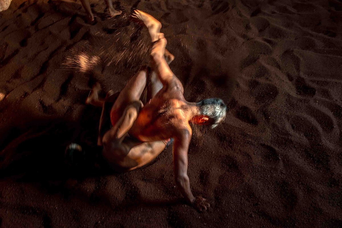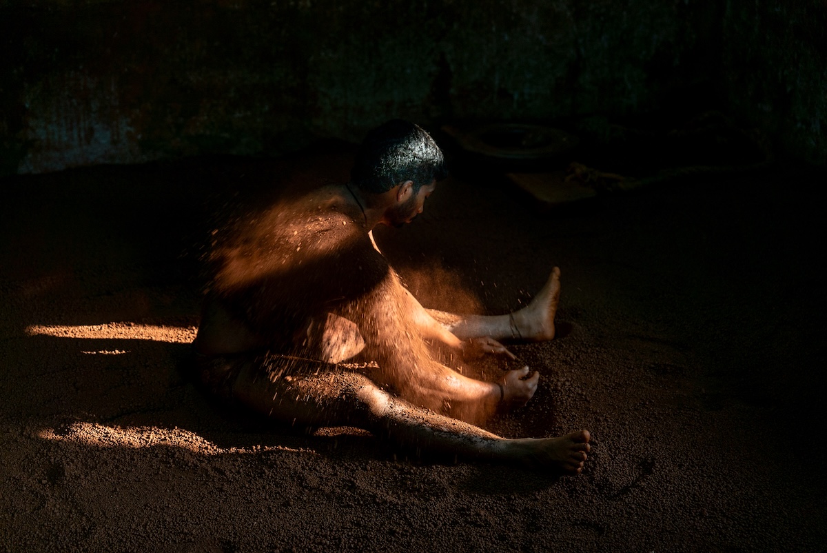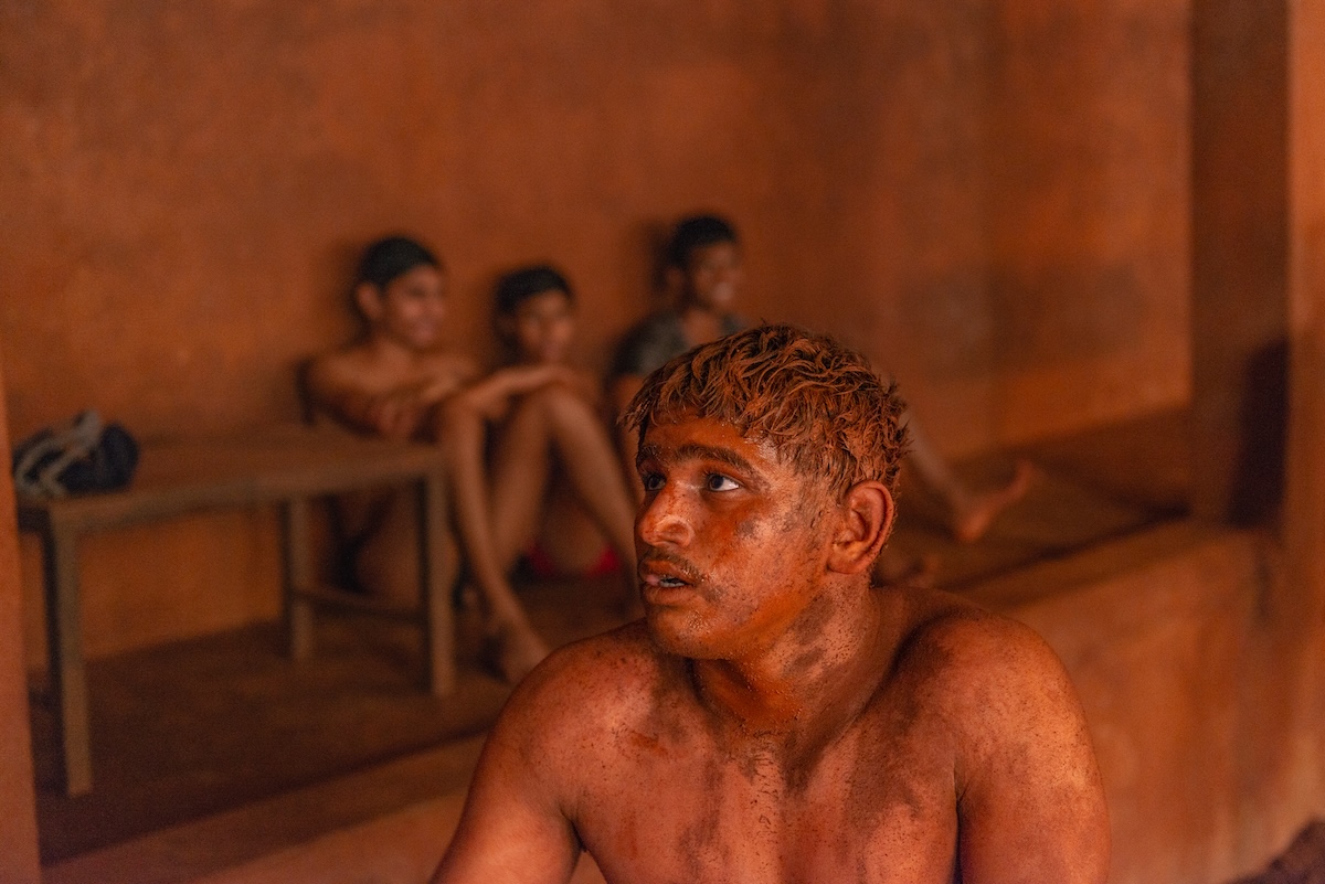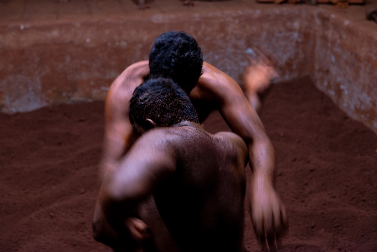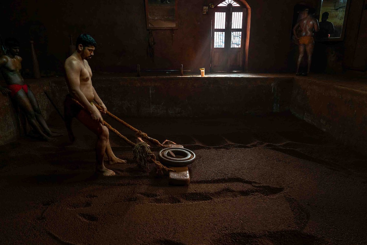 Once warmed up, they dive into the sunken pit and practice kushti, a traditional and popular form of wrestling played on red soil mixed with a number of ingredients – from camphor, coconut milk and turmeric to ghee, lemon juice and herbs.